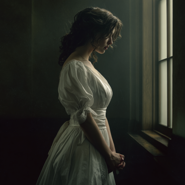 She pulls up the zip of her red, tight dress,Delicately covering her marble-white chest.Her long, curly hair is still a...