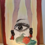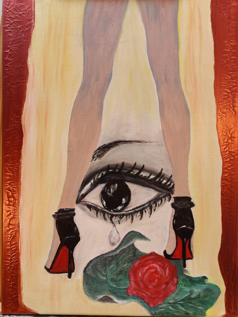 The eye represents awareness and self-knowledge.The heels show confidence and femininity.The tear shows the struggle between being desired and staying free.The rose represents beauty and attraction, but also strength.